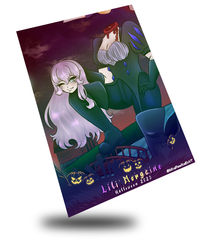 1 of 8 Cards that combines to create a full illustration celebrating Halloween 2025 with the VT-Cards Crew! This Holographic Trading card features @LiliMorgaine in her Headless Horsemen Halloween costume. Featuring artwork by @MiraPawlita. Collect all 8 cards to create the full image and celebrate Halloween right this year by adding all these costumes to your collection!