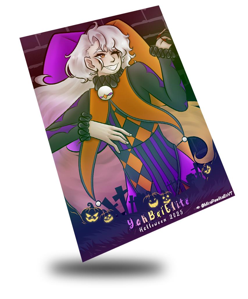 1 of 8 Cards that combines to create a full illustration celebrating Halloween 2025 with the VT-Cards Crew! This Holographic Trading card features @YahBoiElite in his Jester Halloween costume. Featuring artwork by @MiraPawlita. Collect all 8 cards to create the full image and celebrate Halloween right this year by adding all these costumes to your collection!
